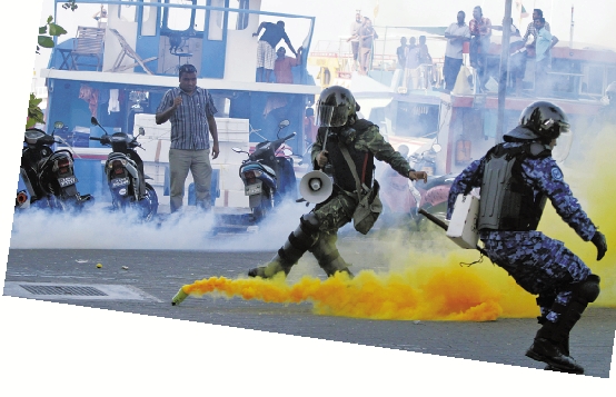 2月8日,马尔代夫数千民众支持前总统纳希德,街头示威同警方发生冲突。 视野网供图