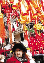 一名美国妇女在纽约曼哈顿唐人街的华人店铺前驻足观看。