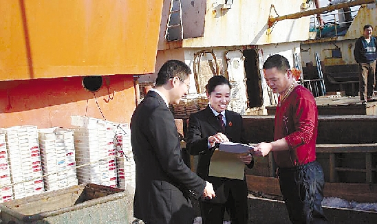 象山“进村入企”联合指导组工作人员在船上向渔民宣讲信贷支农政策。