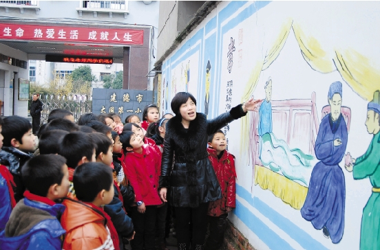 2月13日,在建德市大同第一小学的“美德长廊”下,老师在一幅幅“二十四孝图”的墙画前,向学生们讲解孝敬长辈的道理。 宁文武 摄