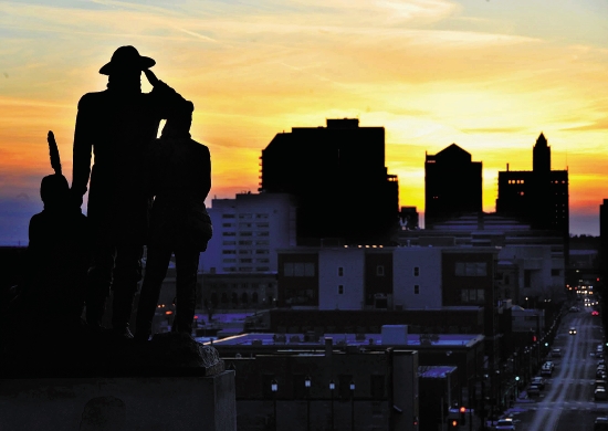 美国中西部的艾奥瓦州是习近平访美的重要一站。图为2月12日,在艾奥瓦州首府得梅因,广场上的城市雕塑守望着夕阳下的街区。 新华社发