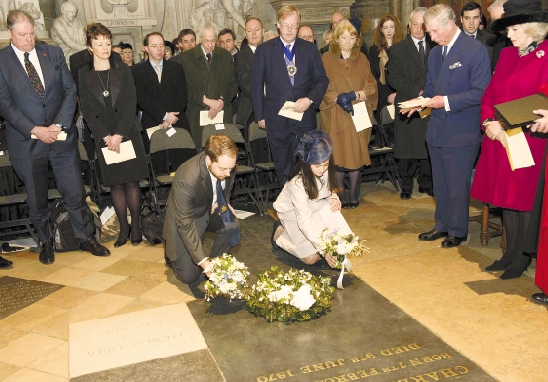 2月7日,英国作家查尔斯·狄更斯的后人在狄更斯落葬地伦敦威斯敏斯特教堂参加狄更斯诞辰200周年的纪念活动。 新华社发