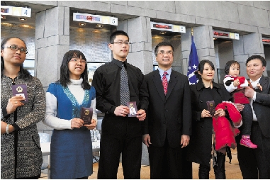 2011年12月14日,美国驻华使馆领事部发布消息,截至上周,当年美国驻华使团处理的签证申请数量已达100万件,比去年同期增长34%。为庆祝这一特殊时刻,使馆举办了一次特殊的签证颁发仪式,美国驻华大使骆家辉向部分获得签证的中国申请人颁发签证。 新华社发