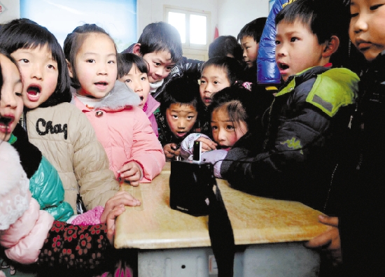 2月27日,在嘉兴秀洲区长虹民工子弟学校,由于没有乐器,音乐老师只好用移动硬盘下载歌曲,再用扩音器播给孩子们听,让他们跟着学唱。