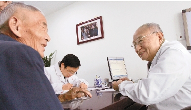 何任(右一)为患者脉诊。