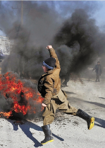 2月22日,在阿富汗喀布尔,一名阿富汗青年喊口号抗议。 新华社发