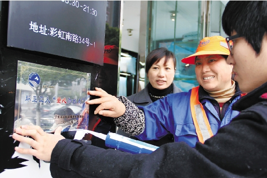昨日下午,宁波市市容环境卫生管理处为54家店铺贴上了“环卫工人爱心加水点”标识,这是宁波首批投用的环卫工民间加水点。自去年12月以来,宁波共有189家单位报名建环卫工人加水点。