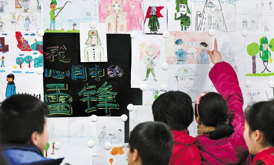 3月1日,嘉兴市辅成小学六年级举行“我心中的雷锋”绘画比赛,孩子们画笔下的雷锋各式各样,但他们都认为雷锋是助人为乐的好人。 唐光峰 祝慧华 摄