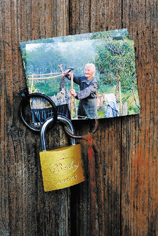胡卫明用相机为胡小英老人拍照,还将洗好的照片搁在门上。