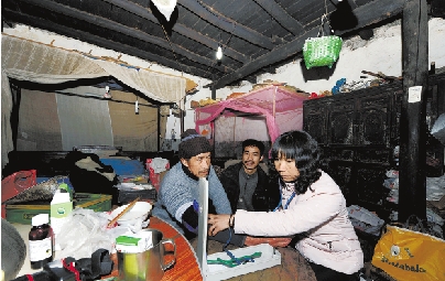 2月24日,服务队里的医生胡东方(右一),在为贫困老人量血压。