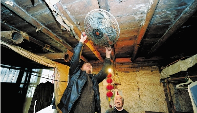 2月24日,服务队队员胡敏江为孤寡老人检查老电扇线路。胡敏江,2000年加入志愿者服务队。