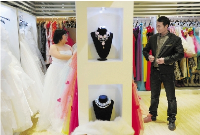 婚期临近,芳芳和海云到婚纱店挑选结婚礼服。