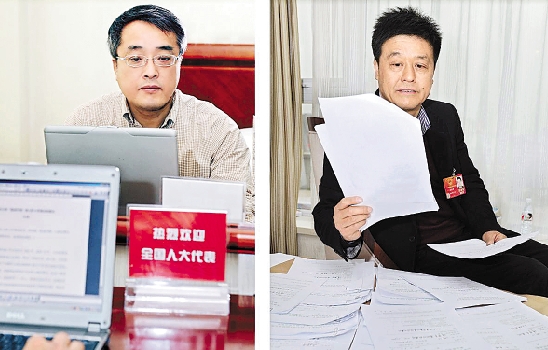 3月3日,我省全国人大代表王鸣(左)、赵林中(右)在精心准备议案和建议。 本报记者 黄曙林 摄
