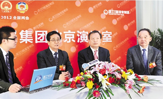 | 3月3日上午,省委书记、省人大常委会主任赵洪祝,省委副书记、省长夏宝龙,省人大常委会副主任王永明等领导看望、慰问了浙报集团全国两会报道前方记者,并接受浙江在线记者的采访。 本报记者 黄曙林 摄 |