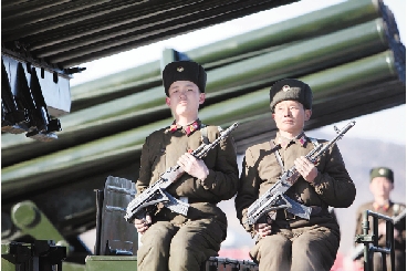 2月16日,朝鲜隆重纪念金正日诞辰70周年的“光明星节”,图为朝鲜士兵接受检阅。 新华社发