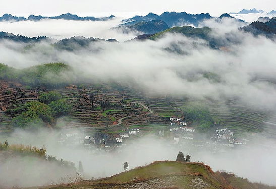 3月4日下午,绵绵春雨出现了短暂停歇,武义县山区新宅乡大莱村一带出现了片片云雾,缭绕在山峦、梯田、农舍间,使人仿佛置身在仙境中。 徐文荣 摄