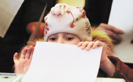 3月4日,一名儿童在俄罗斯首都莫斯科的一处投票站内帮助家人投票。 新华社记者 李勇 摄