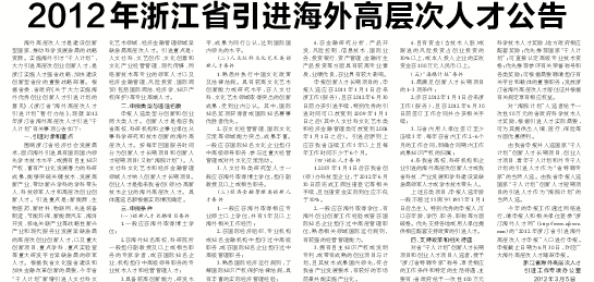 2012年浙江省引进海外高层次人才公告