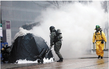 3月6日,在韩国首尔,警察在反恐演练中模拟排除爆炸装置。当日,韩国警方在首尔举行核安全峰会反恐综合演练。第二次核安全峰会将于3月26日至27日在首尔举行。 新华社发
