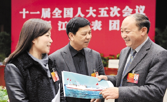 浙江海洋经济发展示范区和舟山群岛新区给舟山带来了前所未有的发展机遇。来自舟山的全国人大代表李科平(右一)拿着他的远洋船照片兴奋地向杨晓霞代表(左一)、杨成涛代表(中)介绍发展远洋捕捞业的愿景。 黄曙林 摄