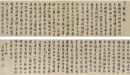 | 舞鹤赋(书法) 徐家铮 徐家铮,书法家,中国书法家协会会员,擅行书,隶书,曾为杭州名刹净慈禅寺书《重建钟楼记》、为普陀山慧济寺书《精刻历朝名画观音宝像后记》等碑文。他的《舞鹤赋》,以行楷书写长文,洋洋洒洒,蔚为大观。其书写行笔点划之间可以看出,楷书的技法多于草书法,是以楷书的功底筑基,又稍加以草书化,点划之间或有勾连。总体来说,是行楷书的风格。作品通篇面貌规整划一,因此展现出楷书端庄“如君子”的韵味,又不乏行书洒脱跳动的美感。在布局、格调上错落有致,温文典雅。在笔法、字法、章法这些表面的书法技法之外,遒劲的用笔圆润稳重,潇洒的点划无拘无束,气度大方,变化多姿 ,展现出中国书法敦厚的风骨。 (潘欣信) |