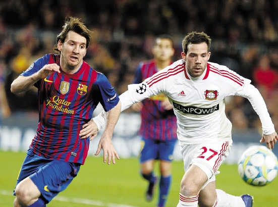 3月7日,在2011/2012欧洲足球冠军联赛八分之一决赛次回合的比赛中,巴塞罗那队主场以7比1战胜勒沃库森队。图为巴塞罗那队球员梅西(左)在比赛中与勒沃库森队球员卡斯特罗拼抢。 新华社发