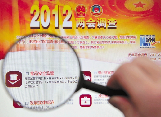 在2012年两会网民最关注的“五个热点话题”中,食品安全监管成为网民新的两会关注点。 新华社发