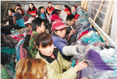日前,德清县武康环卫所捐赠200多件服装,送到筏头乡勤劳村慈善超市,供外来工挑选。 报道组 姚海翔 潘宗敏 摄