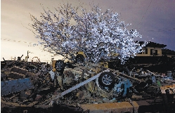 2011年4月18日,在日本宫城县名取市,废墟上樱花盛开。