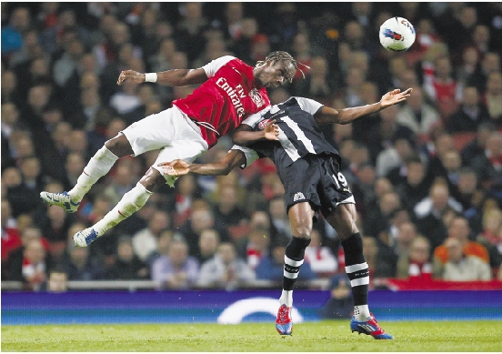 3月12日,在2011/12赛季英格兰足球超级联赛第28轮的比赛中,阿森纳队主场以2比1战胜纽卡斯尔队。图为阿森纳队球员萨尼亚(左)在比赛中争顶头球。 新华社发