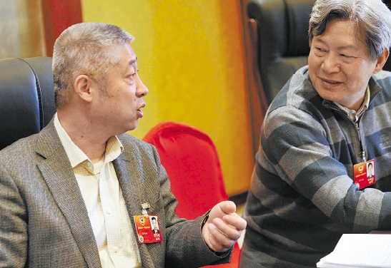 全国政协常委、普天东方通信集团总裁张泽熙(左)和张华军委员(右)在讨论金融体制改革。 吴海森 摄