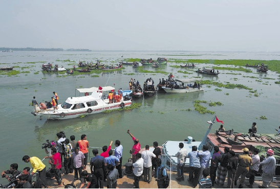 3月13日,在孟加拉国首都达卡南部蒙希甘杰县附近的梅克纳河,营救人员在事故地点展开营救。 新华社发