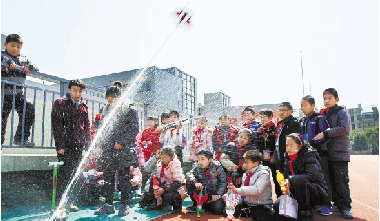 3月14日,嘉善县第二实验小学科技兴趣小组,利用废饮料瓶动手制作“火箭”,培养了孩子们的环保习惯,还增强了动手能力。 胡凌翔 吴斌杰 摄