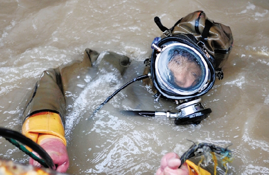 2月27日,在温岭石塘港附近海域,郭文标穿着潜水衣在海中作业。