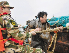 2月27日,在温岭石塘港附近海域,郭文标和边防官兵正在救助现场工作。