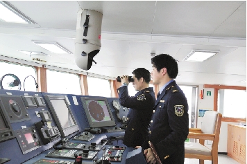 这是中国海监50船大副李一民(左)和水手朱耀滔驾船驶往钓鱼岛附近海域。 新华社记者 张建松 摄