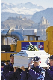 3月16日,在瑞士西部的西翁机场,几名警察抬着装有车祸遇难者遗体的棺材。当天,比利时军用运输机将瑞士恶性车祸遇难者的遗体运送回国。13日发生在瑞士瓦莱州谢尔镇附近的恶性车祸造成包括22名儿童在内的28人丧生和24名儿童受伤。 新华社发