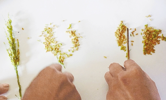 在绍兴县孙端镇种植成功的甬优12号水稻,每支稻穗的结穗数多达600余粒。 绍兴县报记者 高洁 摄