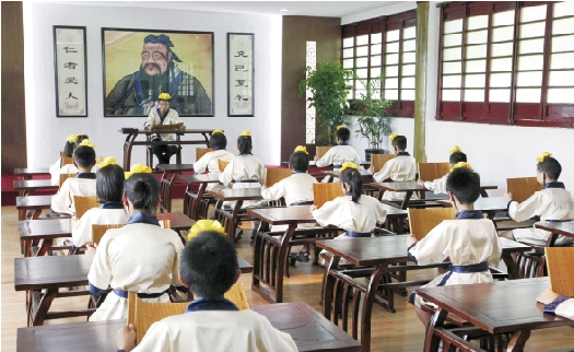千百年来,孔子的“修身、齐家、治国、平天下”、“仁、义、礼、智、信、忠恕、中庸”等思想影响了一代又一代中国人。图为萧山区义桥镇“孔子学堂”,孩子们身着古代学生服朗读《论语》。 (本报资料图片)