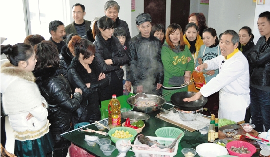 3月19日,玉环县龙溪乡农家乐经营户相聚在龙攻门村,在政府举办的免费培训班上学习烹饪技术,提高农家乐的服务水平。
