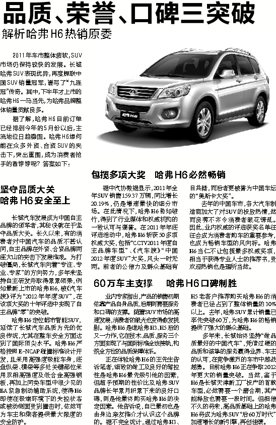 多年来,长城始终坚持“做品质最好的中国汽车”,凭借过硬的品质和诚挚的服务赢得业界、车主的认可,在竞争激烈的车市中越战越勇。目前哈弗H6正在争取2012年更大的销量突破。当然,鉴于H6是长城天津新工厂投产的首款车型,必然需要一个磨合期,其产能释放也需要一段时间。但相信不久的将来,高品质基础上的哈弗H6将成为哈弗SUV“后60万时代”加速增长的新引擎,再创佳绩。