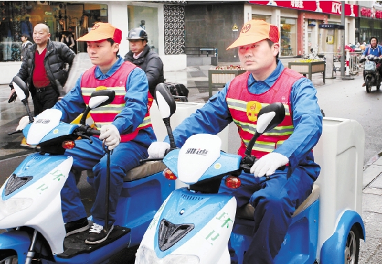 昨天,宁波海曙区首批13辆保洁电瓶车上路,保洁员用于替代自行车捡取垃圾。