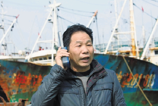 浙瑞渔01313船长周学胜昨用海事卫星电话通话。瑞安市近日为渔船编组中队免费配置海事卫星电话,保障海上应急救援。 瑞安日报记者 庄颖昶 摄