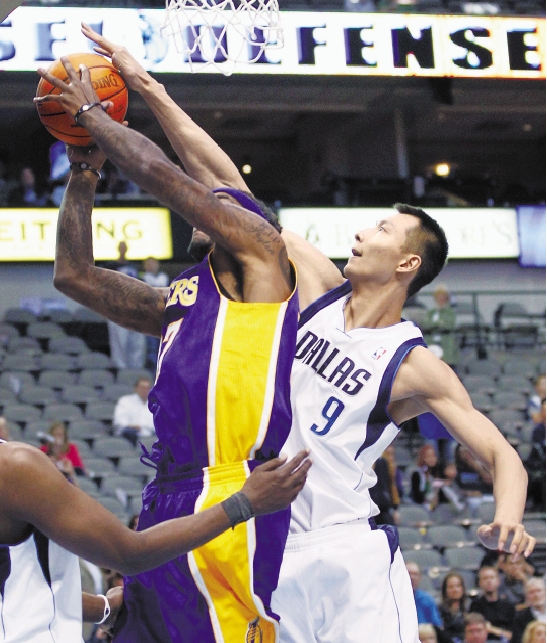 图为达拉斯小牛队球员易建联(右)在比赛中封盖洛杉矶湖人队球员希尔的投篮。 新华社发