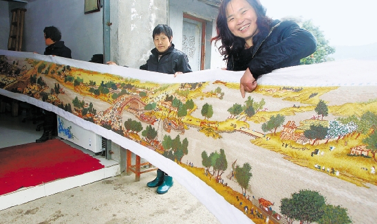 3月23日,绍兴县富盛镇乌石村农妇卢水红展示自己历时两年半绣成的《清明上河图》。这幅长卷用了79种不同颜色的线,全长6米,高0.7米,描绘的是全版《清明上河图》。 梁永锋 摄