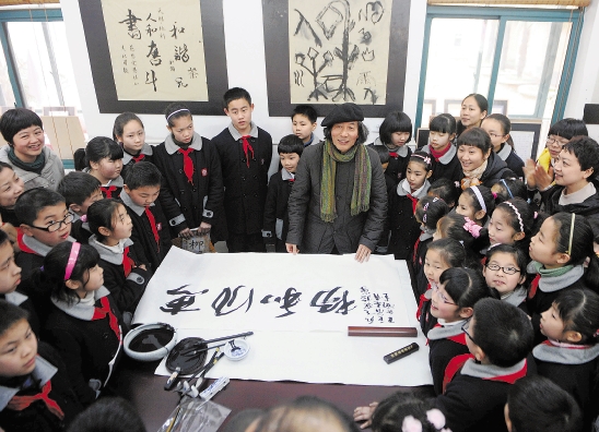 | 昨日下午,由浙江日报报业集团指导,兰亭书法社主办,钱江晚报承办的“”活动在全国书法教育实验学校杭州永天实验小学举行,学生们在老师的带领下放声齐诵《兰亭序》,以纪念《兰亭序》诞生1660年。 由浙报集团组建、中国美术学院教授王冬龄先生担任社长的兰亭书法社,自去年成立以来,一直致力于书法艺术的社会化、大众化传播和弘扬。图为王冬龄给孩子们指导书法。 记者 董颖 胡元勇 摄 书风和畅 校园行 |