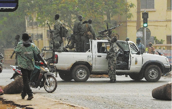 3月22日,政变军人聚集在马里首都巴马科的国家电视台门前。 新华社发(迪奥普 摄)