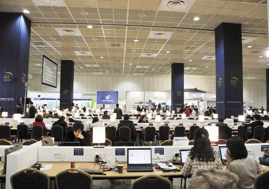 3月25日,记者们在位于韩国首尔国际会展中心的核安全峰会媒体中心工作。 新华社记者 刘立伟 摄