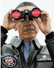 3月25日,在韩朝边境非军事区板门店共同警备区的一个观察哨,美国总统奥巴马用望远镜向朝鲜观察。