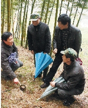 周文伟在竹林和农民探讨“竹兜施肥”法。 高斌 摄